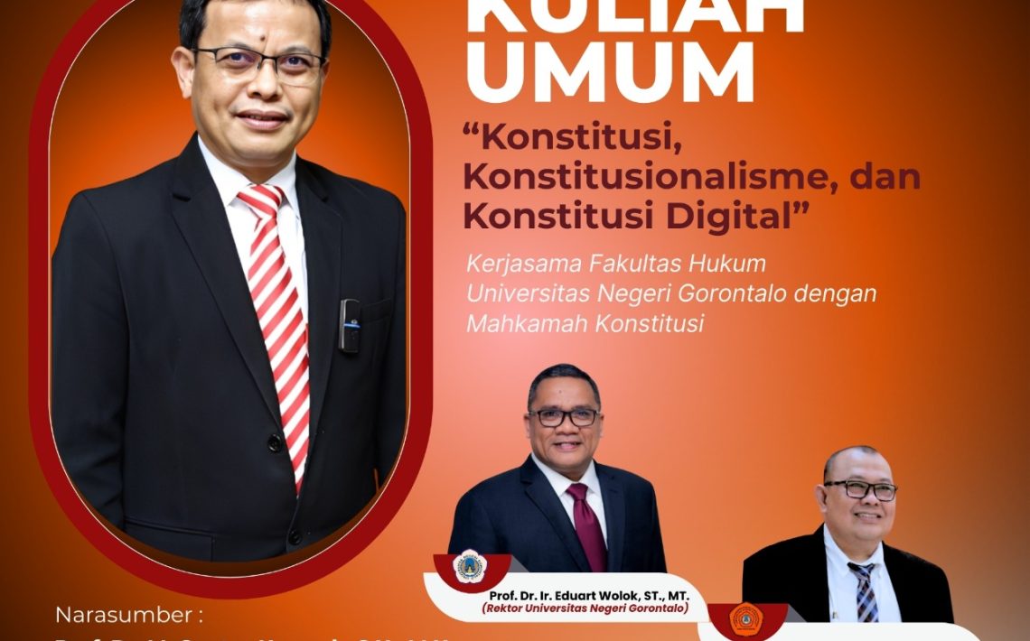 GORONTALO — Fakultas Hukum Universitas Negeri Gorontalo mengundang seluruh civitas akademika, mahasiswa, dosen, serta pemerhati hukum untuk menghadiri Kuliah Umum bertajuk “Konstitusi, Konstitusionalisme, dan Konstitusi Digital”. Kegiatan ini merupakan hasil kerja sama antara FH UNG dan Mahkamah Konstitusi Republik Indonesia. Kuliah umum akan menghadirkan narasumber […]