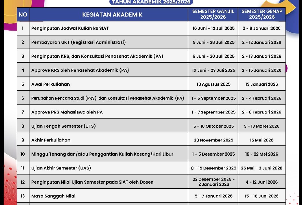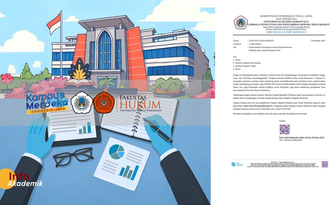 Universitas Negeri Gorontalo menginformasikan jadwal pelaksanaan kegiatan akademik akhir Semester Ganjil Tahun Akademik 2025/2026 sebagai acuan bagi fakultas, program vokasi, dan program pascasarjana dalam mengatur pelaksanaan kegiatan akademik di lingkungan universitas. Ketetapan tersebut tertuang dalam surat Wakil Rektor Bidang Akademik UNG Nomor: 5110/UN47.1/PK.01.03/2025 tertanggal 10 November […]