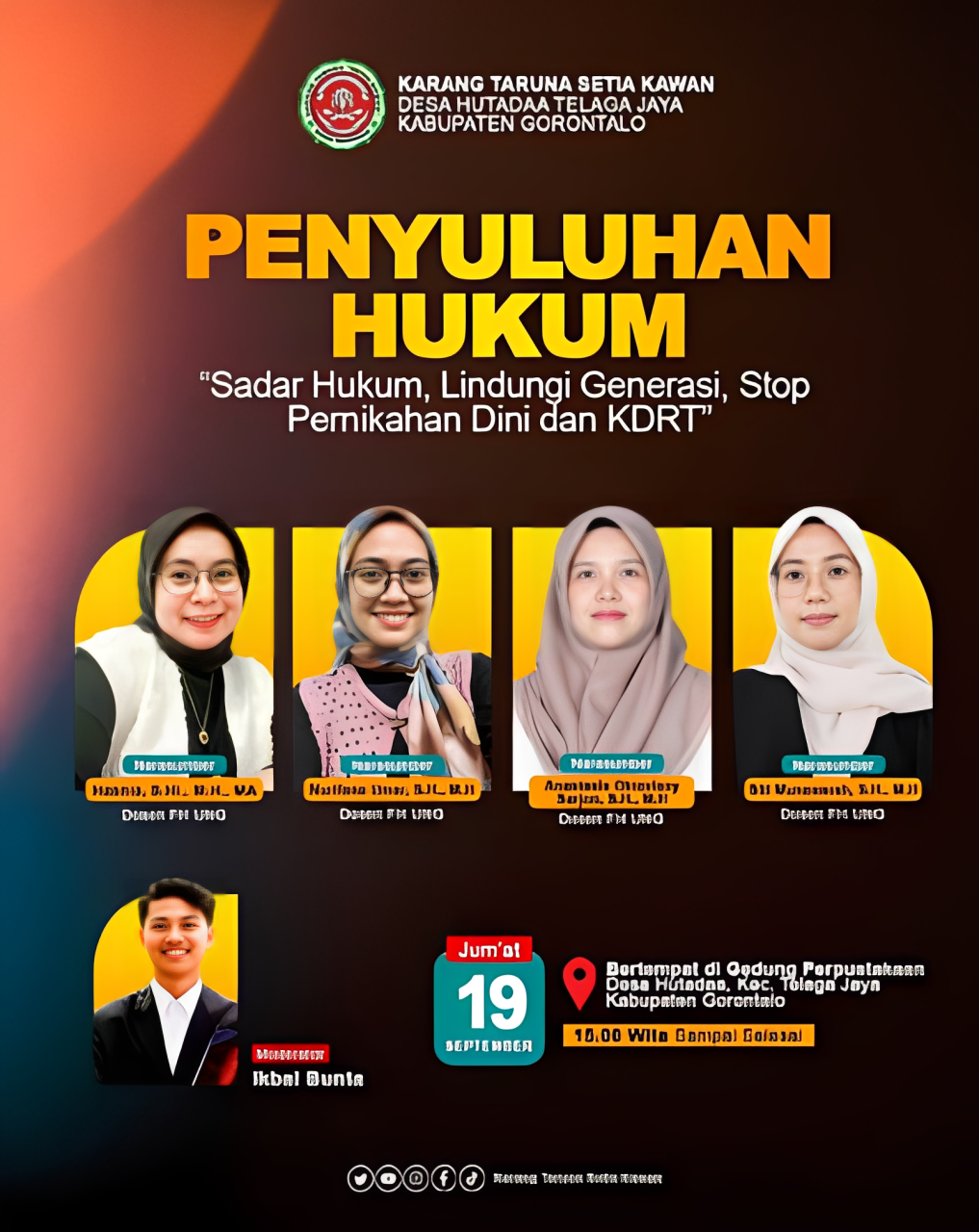 GORONTALO — Upaya membangun kesadaran hukum masyarakat terus digencarkan oleh Fakultas Hukum Universitas Negeri Gorontalo. Kali ini, para dosen FH UNG bersama Karang Taruna Setia Kawan Desa Hutadaa Telaga Jaya melaksanakan kegiatan Penyuluhan Hukum dengan tajuk “Sadar Hukum, Lindungi Generasi, Stop Pernikahan Dini dan KDRT” pada Jumat, 19 September 2025 di Gedung Perpustakaan Desa Hutadaa, Kecamatan Telaga Jaya, Kabupaten Gorontalo.