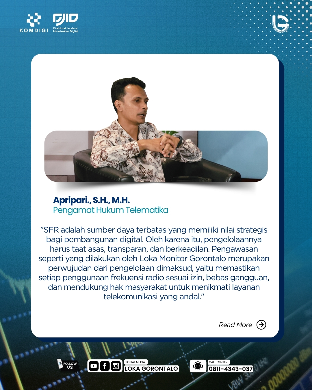 “SFR adalah sumber daya terbatas yang memiliki nilai strategis bagi pembangunan digital. Karena itu, pengelolaannya harus taat asas, transparan, dan berkeadilan. Pengawasan seperti yang dilakukan Loka Monitor Gorontalo menjadi wujud nyata dari upaya menjaga agar setiap penggunaan frekuensi sesuai izin, bebas gangguan, serta mendukung hak masyarakat menikmati layanan telekomunikasi yang andal,” jelas Apripari.
