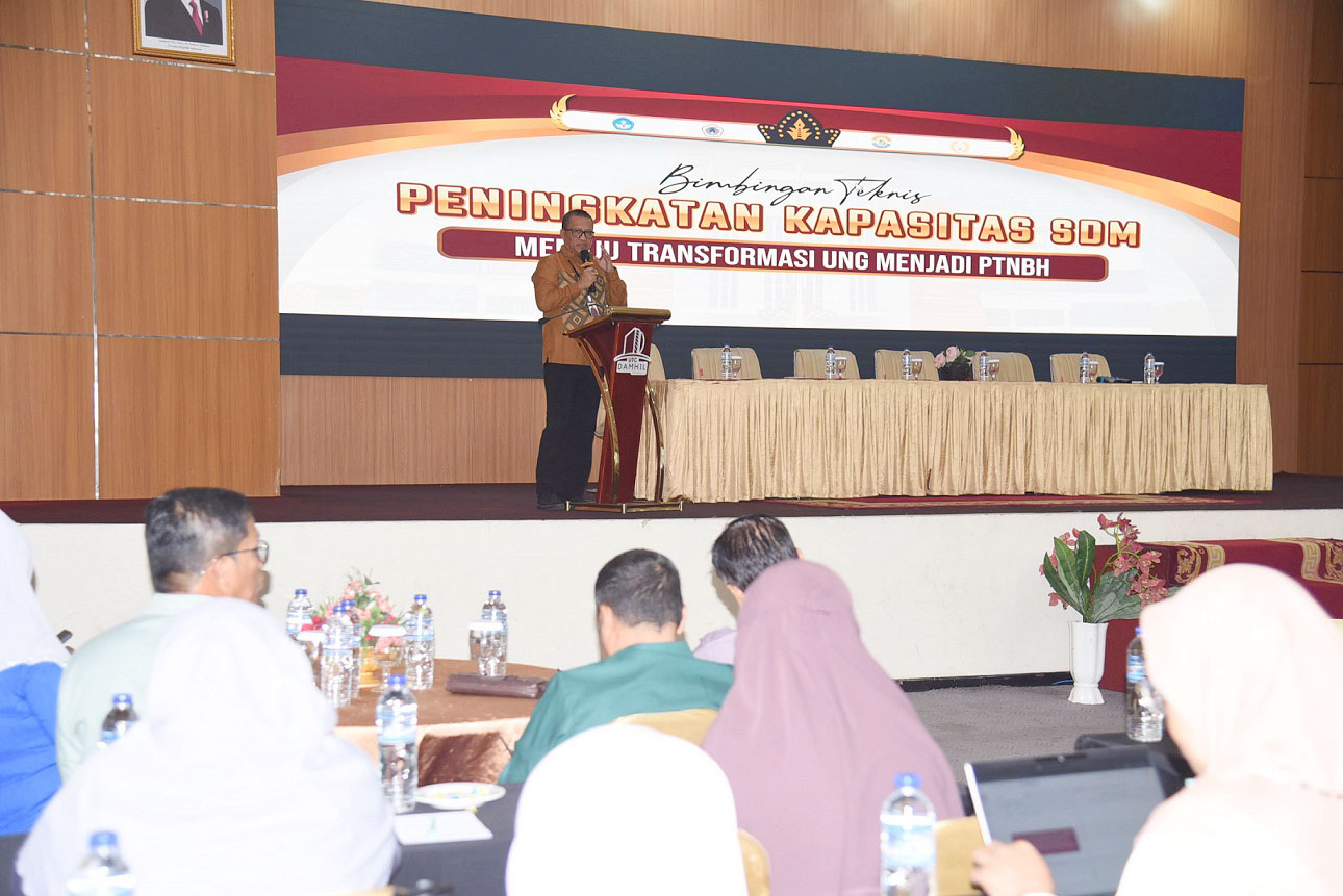 GORONTALO – Universitas Negeri Gorontalo (UNG) terus memantapkan langkahnya menuju status Perguruan Tinggi Negeri Berbadan Hukum (PTN-BH) dengan memperkuat Sumber Daya Manusia (SDM) melalui Bimbingan Teknis (Bimtek) pada Kamis, 27 November 2025. Kegiatan ini diselenggarakan sebagai bukti komitmen penuh UNG dalam melakukan transformasi kelembagaan agar menjadi institusi yang lebih mandiri, akuntabel, dan kompetitif.