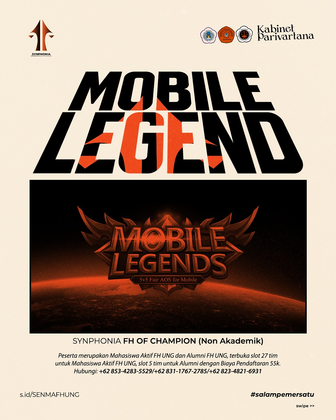 GORONTALO — Dalam rangka menyemarakkan Dies Natalis ke-11 Fakultas Hukum Universitas Negeri Gorontalo, Senat Mahasiswa FH UNG melalui Kabinet Parivartana resmi membuka pendaftaran turnamen Mobile Legend “Synphonia FH of Champion 2025”.