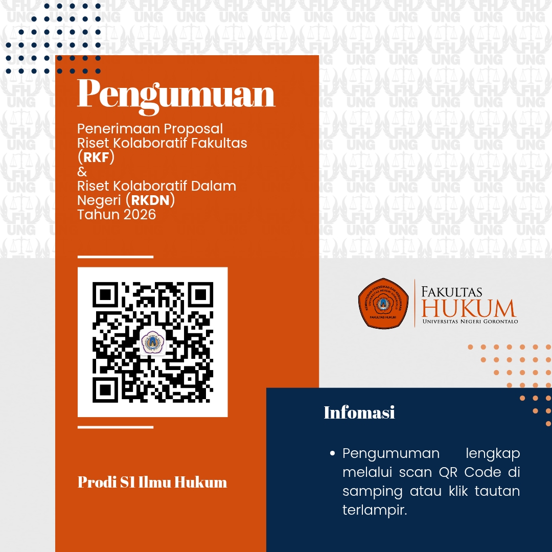 Fakultas Hukum Universitas Negeri Gorontalo (FH UNG) secara resmi mengumumkan pembukaan penerimaan proposal Riset Kolaboratif Fakultas (RKF) dan Riset Kolaboratif Dalam Negeri (RKDN) Tahun 2026. Program ini menjadi bagian dari upaya strategis fakultas dalam mendorong peningkatan kualitas riset, publikasi ilmiah, serta penguatan jejaring kolaborasi akademik di tingkat nasional.