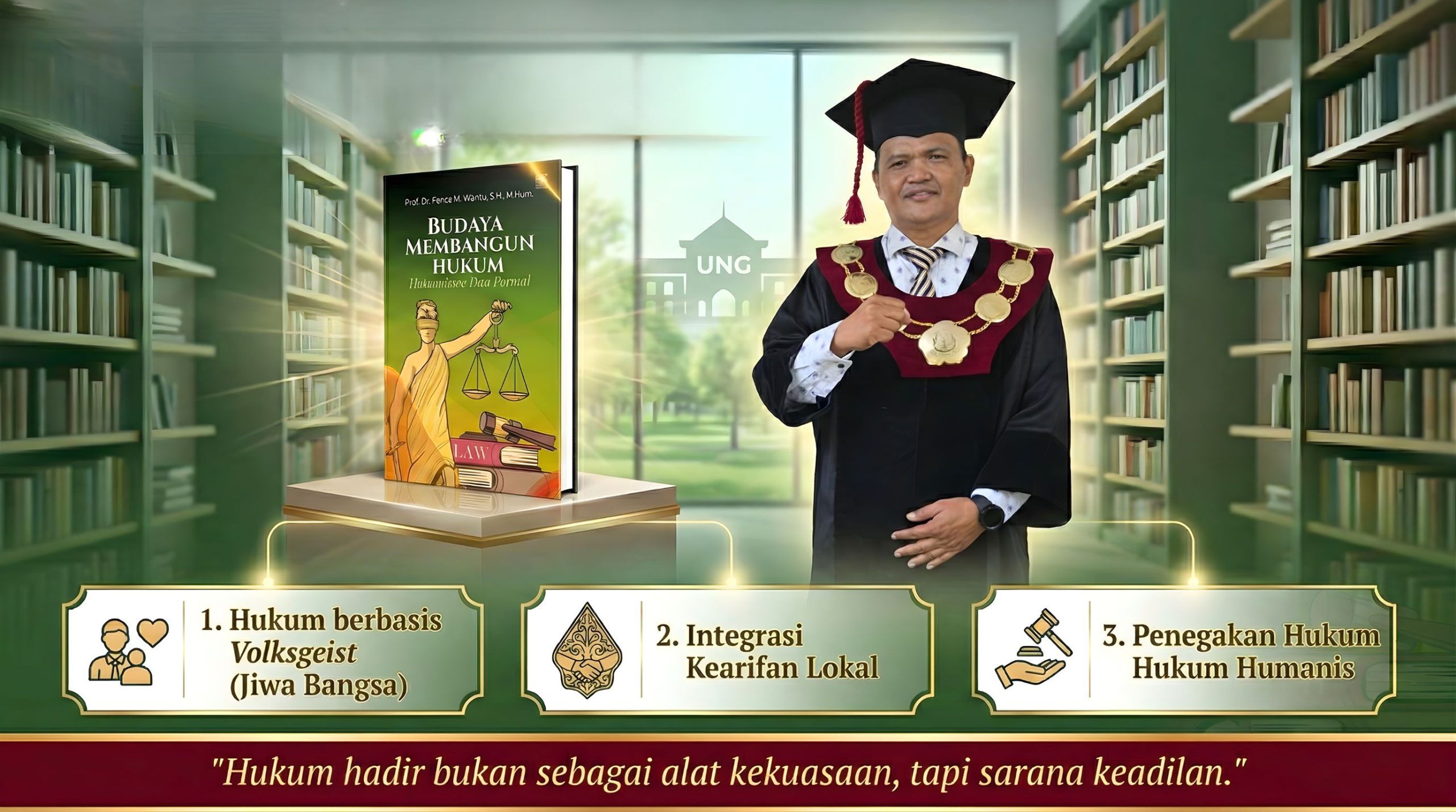 GORONTALO – Sebagai upaya memperkuat fondasi hukum nasional yang lebih beretika dan membumi, Prof. Dr. Fence M. Wantu, S.H., M.Hum., yang merupakan akademisi sekaligus dosen senior di Fakultas Hukum Universitas Negeri Gorontalo (FH UNG), resmi menerbitkan karya literatur terbaru berjudul “Budaya Membangun Hukum: Humanisme dan Formal.”