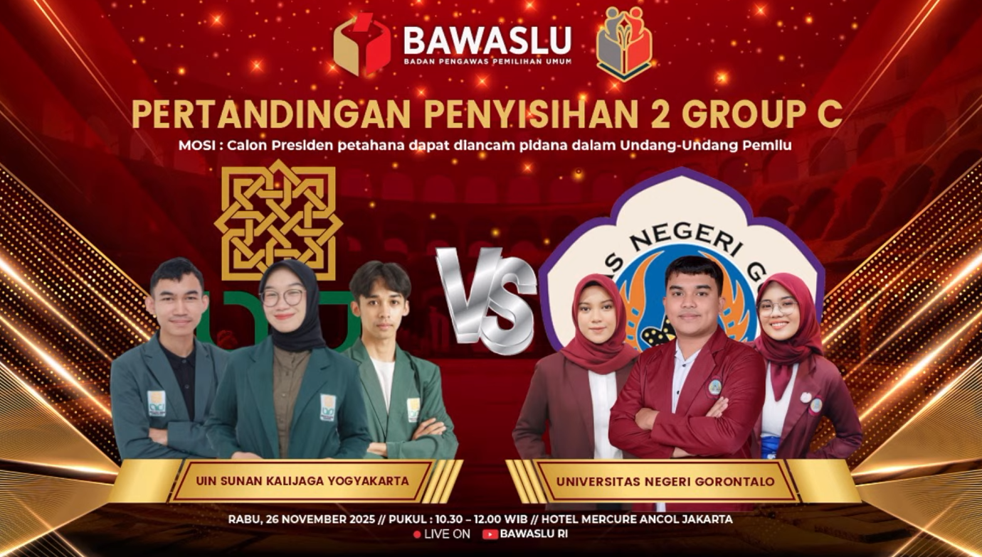 Gorontalo, 26 November 2025 – Pertandingan penyisihan 2 Grup C dalam ajang debat yang diselenggarakan oleh Bawaslu (Badan Pengawas Pemilihan Umum) akan segera digelar pada hari ini, Rabu, 26 November 2025. Dalam pertandingan ini, tim debat dari UIN Sunan Kalijaga Yogyakarta akan berhadapan dengan tim debat dari Universitas Negeri Gorontalo. Topik yang diangkat adalah mengenai “Calon Presiden petahana dapat dijatuhi pidana dalam Undang-Undang Pemilu.”