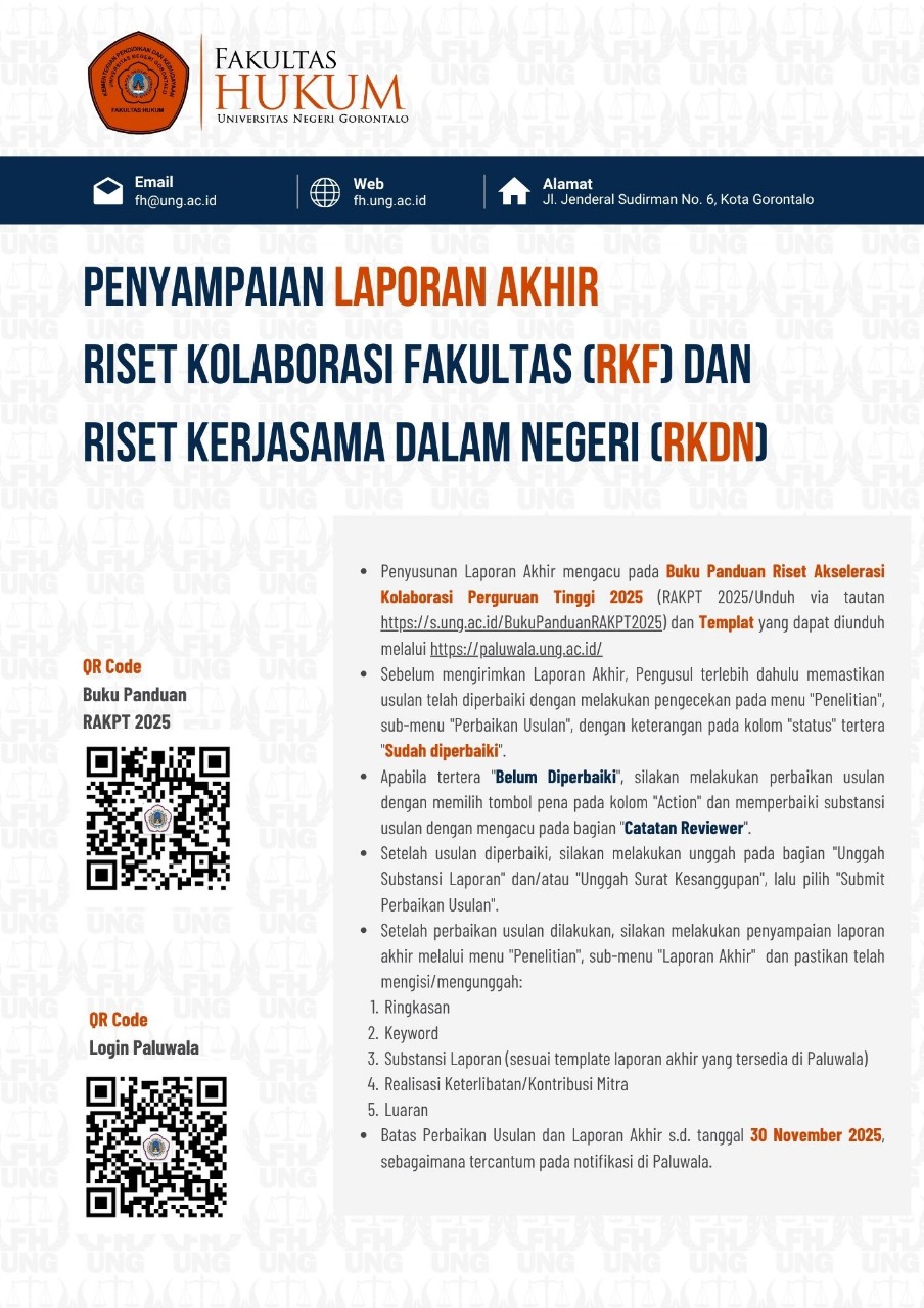 Gorontalo, 1 November 2025 – Fakultas Hukum Universitas Negeri Gorontalo (FH UNG) melalui Program Studi Ilmu Hukum resmi menyampaikan pemberitahuan mengenai mekanisme penyampaian Laporan Akhir Riset Kolaborasi Fakultas (RKF) dan Riset Kerjasama Dalam Negeri (RKDN) tahun 2025. Pengumuman ini ditujukan kepada seluruh peneliti agar memastikan laporan akhir disusun dan diunggah sesuai prosedur yang telah ditetapkan.