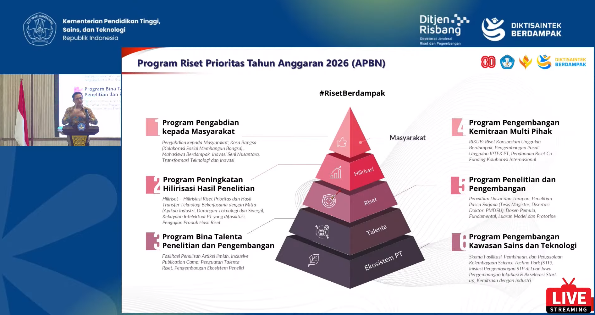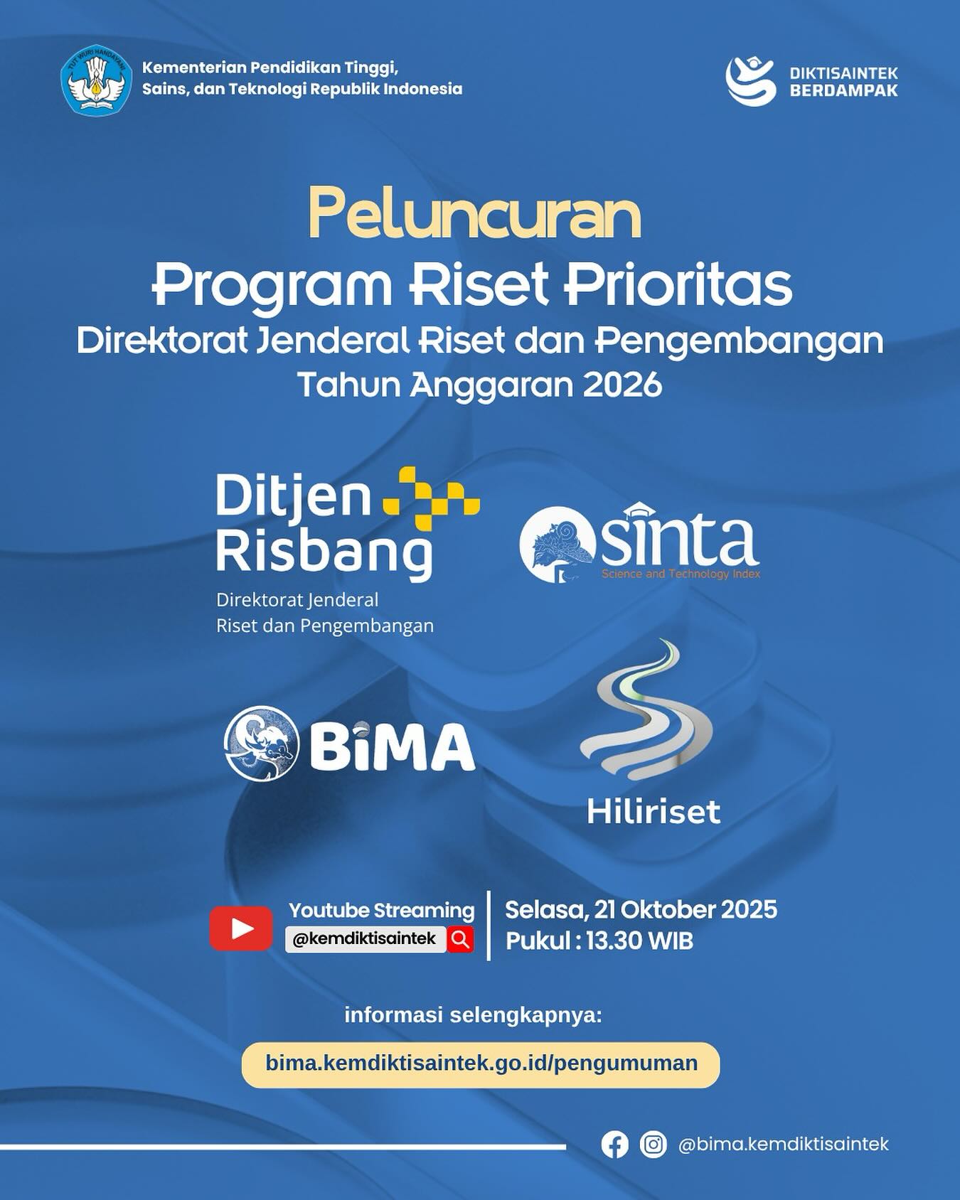 Jakarta — Direktorat Jenderal Riset dan Pengembangan (Ditjen Risbang), Kementerian Pendidikan Tinggi, Sains, dan Teknologi Republik Indonesia, resmi meluncurkan Program Riset Prioritas Tahun Anggaran 2026 pada Selasa, 21 Oktober 2025, pukul 13.30 WIB. Acara peluncuran ini disiarkan secara langsung melalui kanal YouTube resmi @kemdiktisaintek, dan menjadi momentum penting dalam memperkuat ekosistem riset nasional yang berdampak dan berkelanjutan.