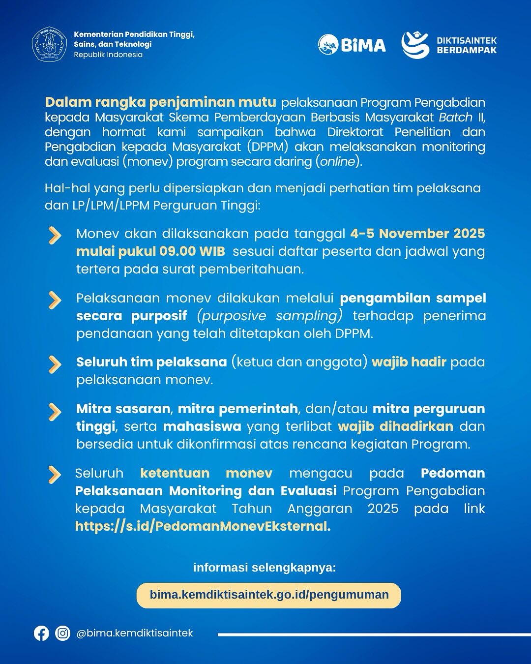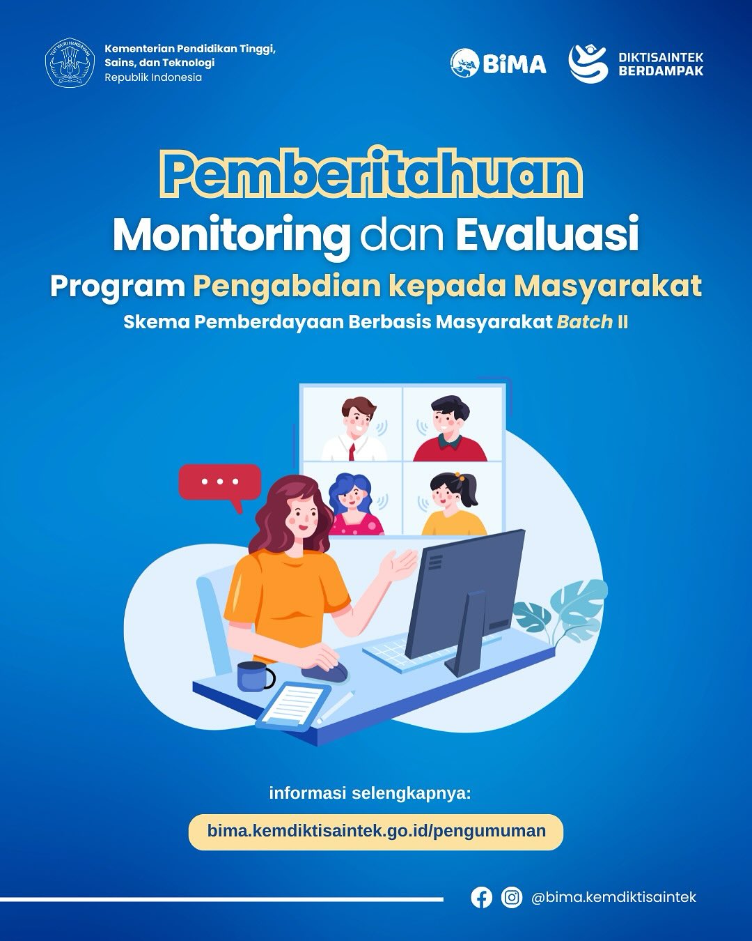 Dalam rangka memastikan mutu pelaksanaan Program Pengabdian kepada Masyarakat Skema Pemberdayaan Berbasis Masyarakat Batch II, Direktorat Penelitian dan Pengabdian kepada Masyarakat (DPPM) akan melaksanakan Monitoring dan Evaluasi (Monev) secara daring dengan ketentuan sebagai berikut: