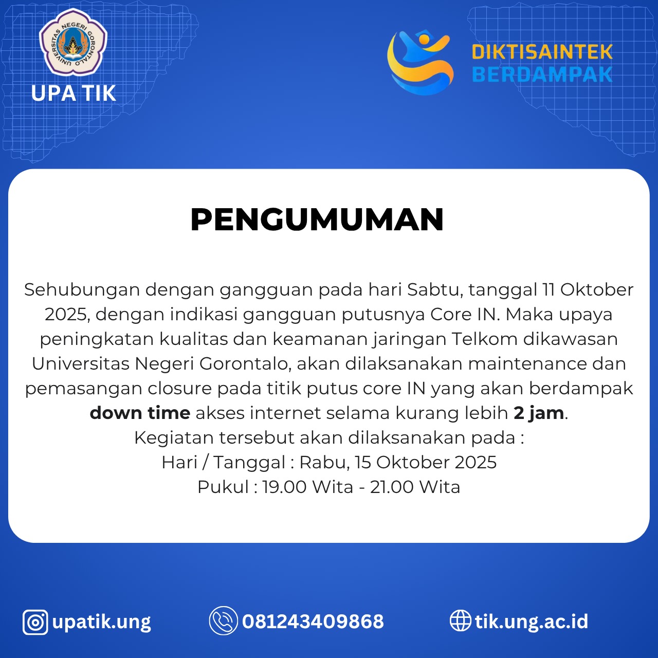 Kegiatan pemeliharaan ini dijadwalkan berlangsung pada Rabu, 15 Oktober 2025, pukul 19.00 hingga 21.00 WITA. Selama proses maintenance berlangsung, akses internet di kawasan kampus UNG akan mengalami down time atau gangguan sementara selama kurang lebih 2 jam.