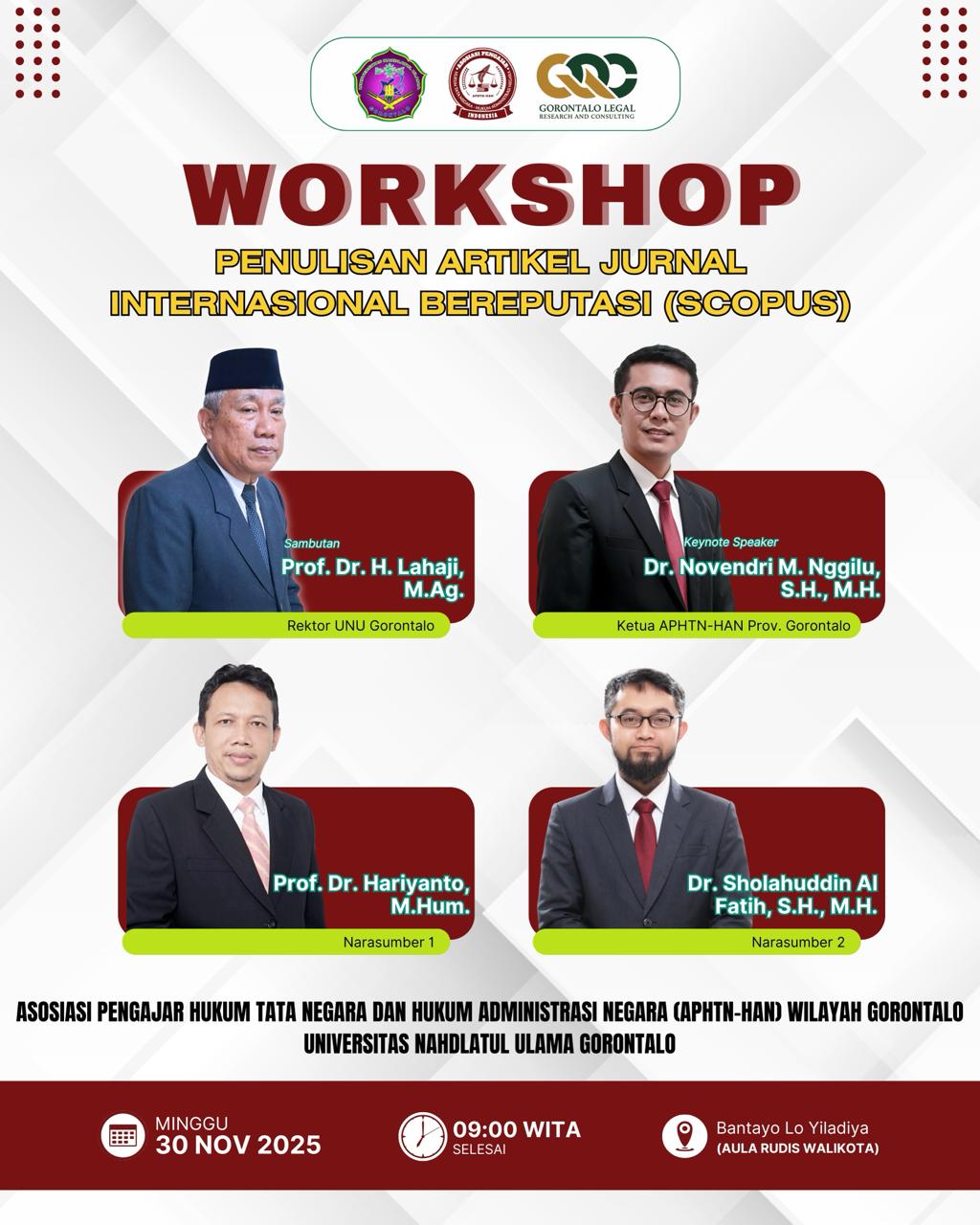 Fakultas Hukum Universitas Negeri Gorontalo (FH UNG) menginformasikan bahwa besok akan diselenggarakan Workshop Penulisan Artikel Jurnal Internasional Bereputasi (Scopus) yang menghadirkan salah satu dosen FH UNG, Dr. Novendri M. Nggilu, S.H., M.H., sebagai Keynote Speaker. Beliau juga menjabat sebagai Ketua APHTN-HAN Wilayah Gorontalo.