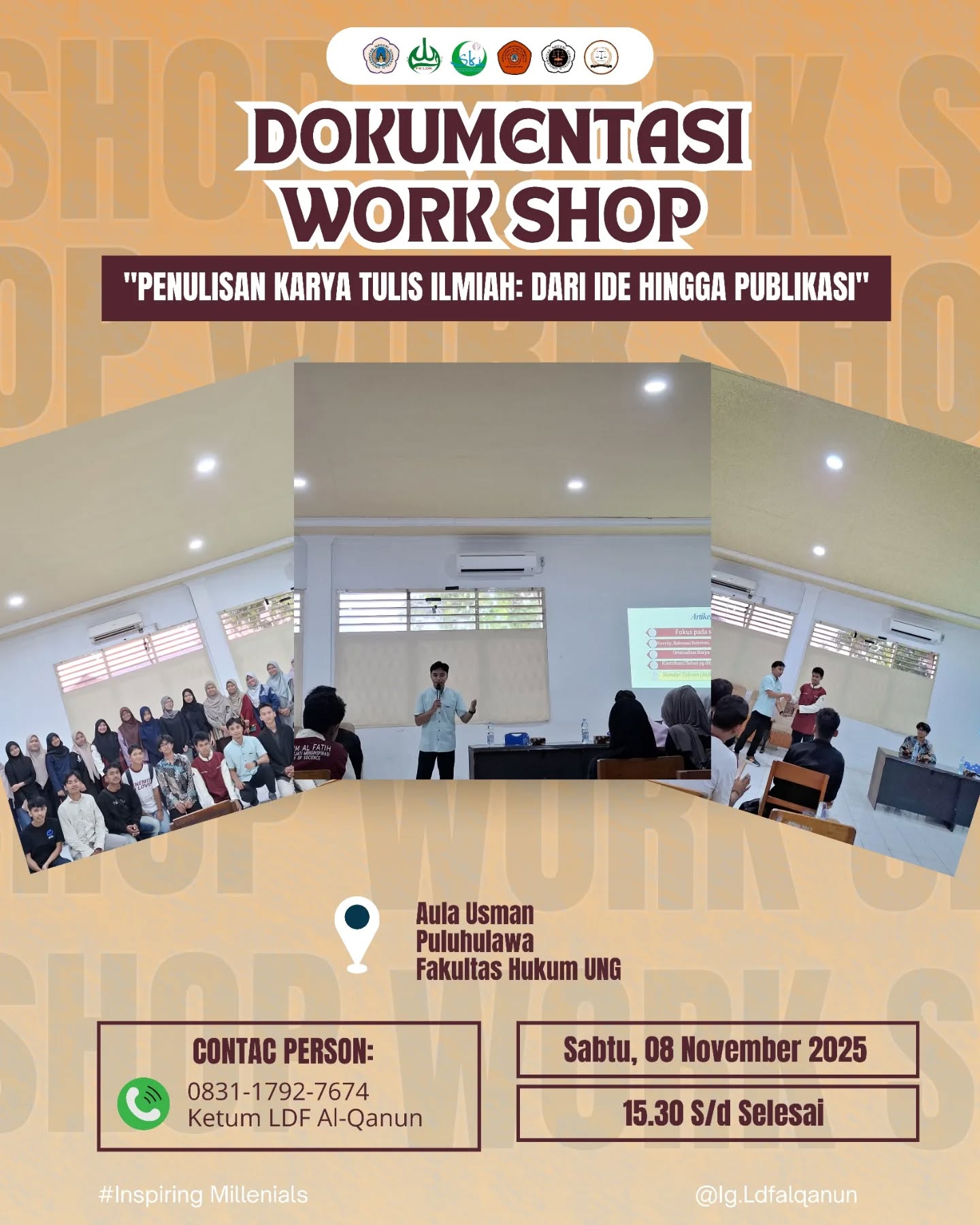 Gorontalo, 08 November 2025 – Lembaga Dakwah Fakultas (LDF) Al-Qanun Fakultas Hukum Universitas Negeri Gorontalo (FH UNG) sukses menggelar Workshop bertajuk “Penulisan Karya Tulis Ilmiah: Dari Ide Hingga Publikasi” yang berlangsung di Aula Usman, Puluhulawa, pada Sabtu, 08 November 2025. Kegiatan ini bertujuan untuk memberikan pemahaman dan keterampilan praktis kepada peserta mengenai proses penulisan karya tulis ilmiah, mulai dari merumuskan ide hingga tahap publikasi.