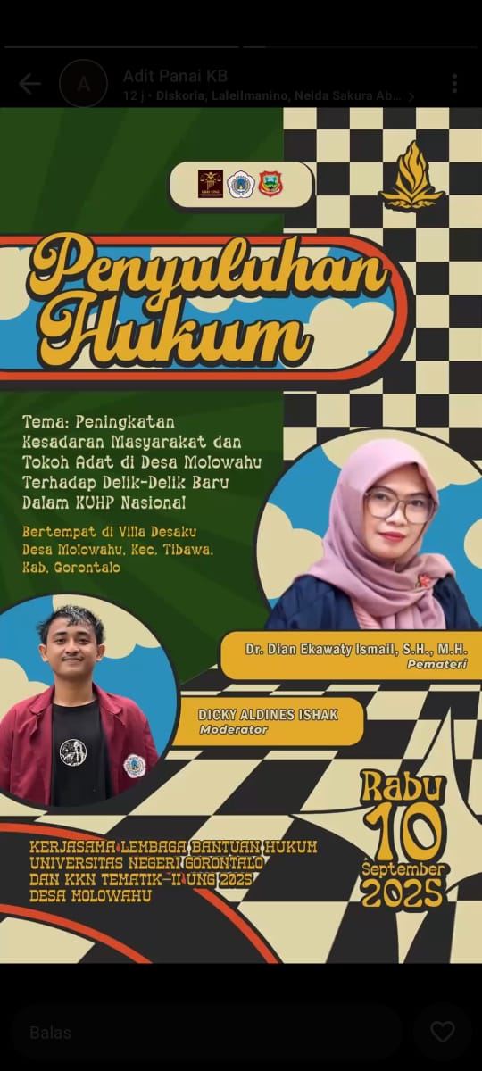 Kegiatan yang mengusung tema “Peningkatan Kesadaran Masyarakat dan Tokoh Adat di Desa Molowahu terhadap Delik-Delik Baru dalam KUHP Nasional” ini menghadirkan Dr. Dian Ekawaty Ismail, S.H., M.H. sebagai pemateri, serta Dicky Aldines Ishak sebagai moderator. Acara berlangsung di Villa Desaku Desa Molowahu dan dihadiri oleh perangkat desa, tokoh adat, mahasiswa KKN, serta masyarakat setempat.