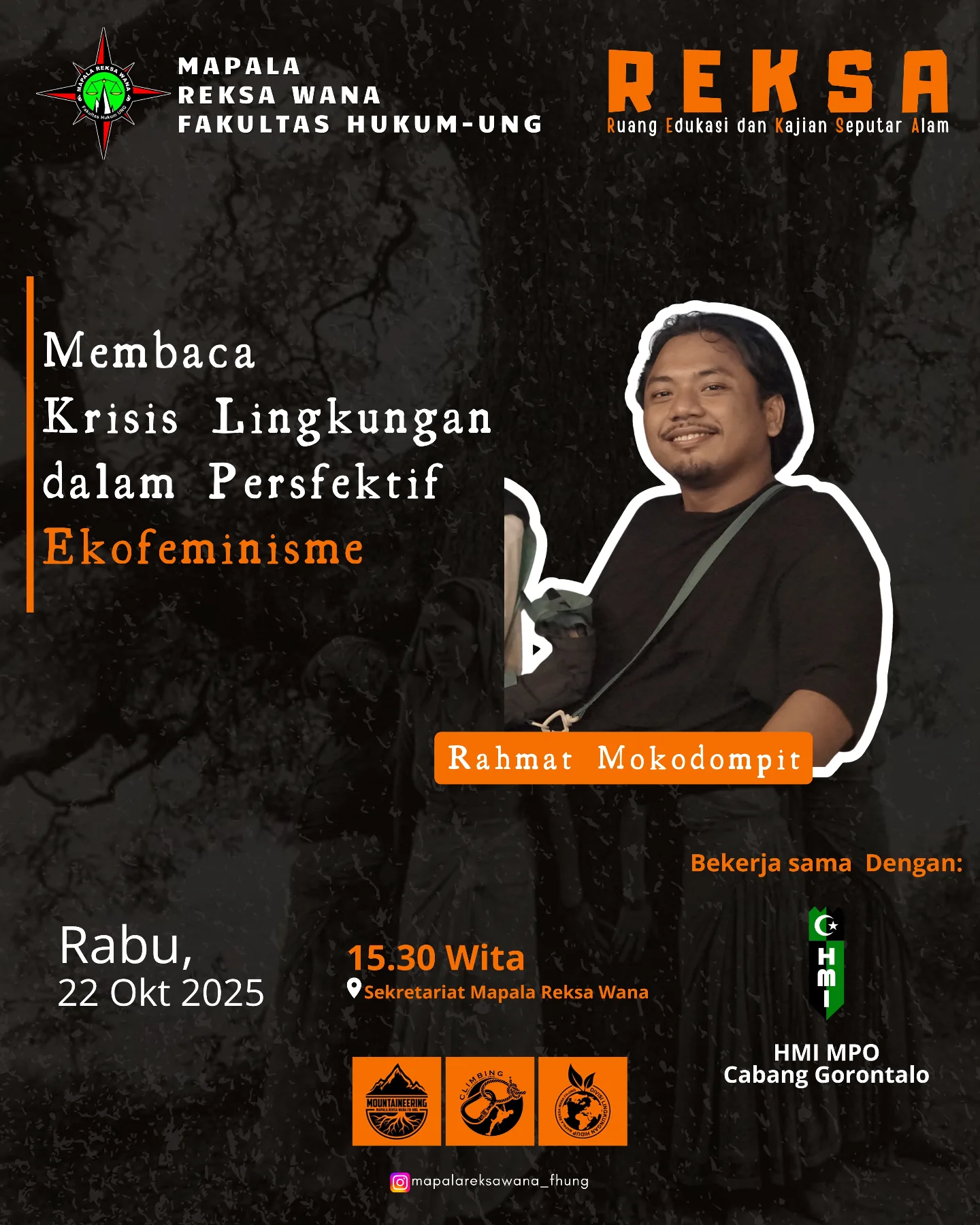 Kegiatan REKSA kali ini terselenggara atas kerja sama antara Mapala Reksa Wana Fakultas Hukum UNG dan Himpunan Mahasiswa Islam (HMI) MPO Cabang Gorontalo. Kolaborasi ini menjadi bukti komitmen bersama untuk menghadirkan ruang belajar kritis lintas disiplin dan memperkuat kesadaran ekologis di kalangan mahasiswa.
