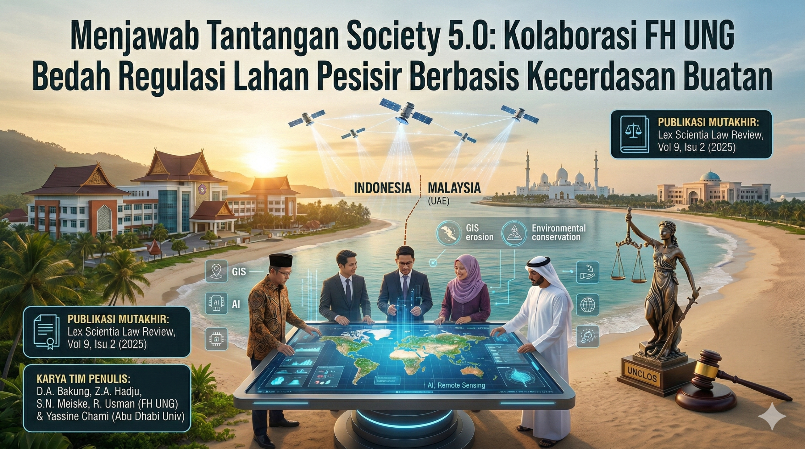 Penelitian komprehensif ini dituangkan dalam artikel ilmiah berjudul “International Legal Regulations on Coastal Conservation of Coastal Boundary Lands Across National Borders in the Digital Era”. Artikel bergengsi ini diterbitkan dalam jurnal bereputasi Lex Scientia Law Review , pada Volume 9 Isu 2 (Tahun 2025), halaman 1408-1445 , dan telah dipublikasikan secara daring sejak 17 November 2025Identitas Penulis Lintas Negara Karya akademik ini lahir dari kolaborasi erat antara dosen-dosen pakar FH UNG dan akademisi internasional. Tim penulis dari FH UNG terdiri dari ; Dolot Alhasni Bakung (FH UNG), Zainal Abdul A. Hadju (FH UNG), Sri Nanang Meiske (FH UNG), Ramadhan Usman (FH UNG), Menariknya, penelitian ini juga menggandeng pakar hukum dari Uni Emirat Arab, yakni Yassine Chami, yang berasal dari College of Law, Abu Dhabi University.