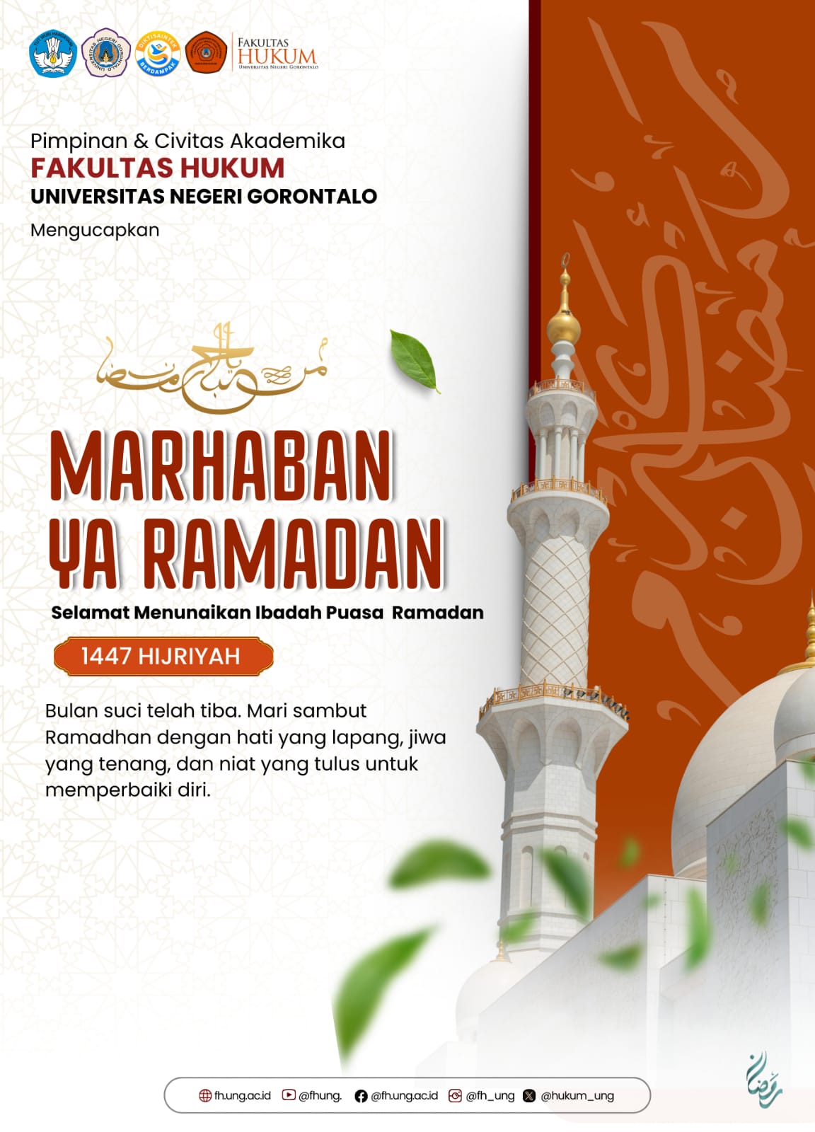 GORONTALO – Menjelang tibanya bulan yang penuh keberkahan, Pimpinan dan segenap Civitas Akademika Fakultas Hukum Universitas Negeri Gorontalo (FH UNG) secara resmi menyampaikan ucapan selamat menunaikan ibadah puasa Ramadan 1447 Hijriyah kepada seluruh umat Muslim, khususnya di lingkungan kampus merah maron.